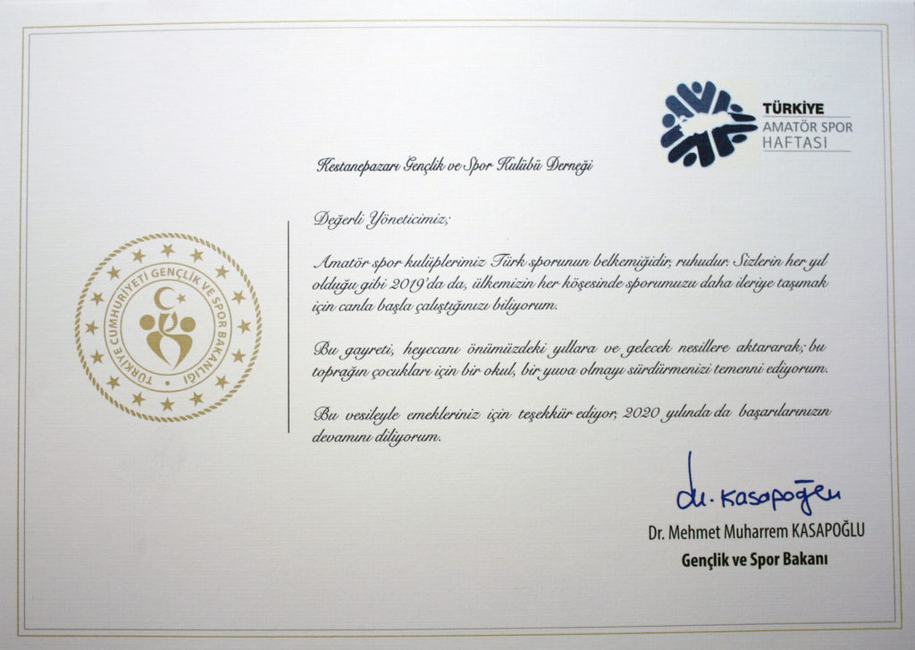Kestanepazarı Gençlik ve Spor Klübü, 2019 yılı faaliyetlerinde gerçekleştirdiği projeler ve sportif başarılarından dolayı Gençlik ve Spor Bakanı Dr. Muharrem Kasapoğlu’ndan Teşekkür Beratı aldı.